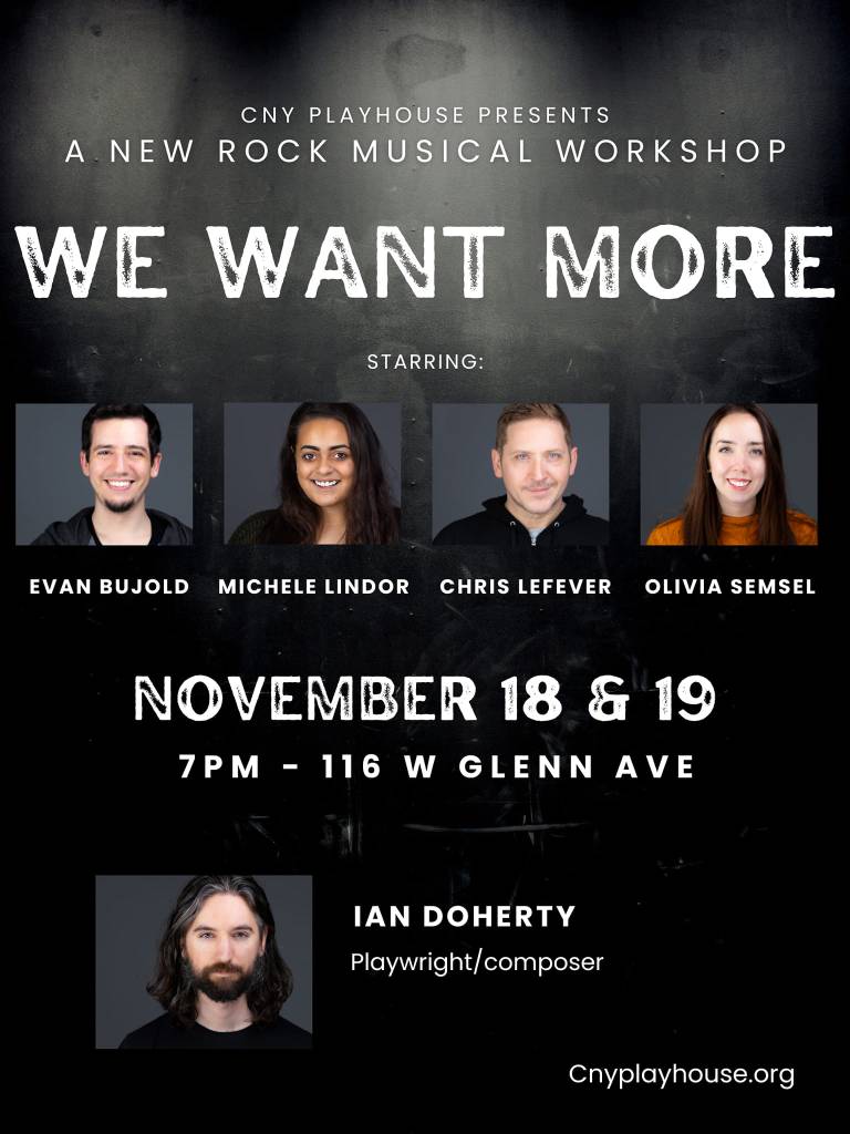 But, I had the extra time on my hands to work on We Want More. I met with one of my oldest friends (and sound engineer on most of my albums), Andrew Sudol, and had some long discussions about the songs and story beats that were important, since at this point, I had several full, disparate drafts of the book and 30+ songs. Rather than write another complete draft from scratch, I ended up assembling a working draft by grabbing my favorite bits from each of the previous drafts, throwing them together, and smoothing out the edges. I submitted that to CNY Playhouse’s script search in late 2021 and asked Lynn Barbado King to direct since 1) she was already familiar with the project through the 2020 house reading, and 2) I had seen her directing and loved it. I also pitched it as a workshop production, since this would be my first time actually putting it on stage, and I knew there would be a lot of kinks to work out.